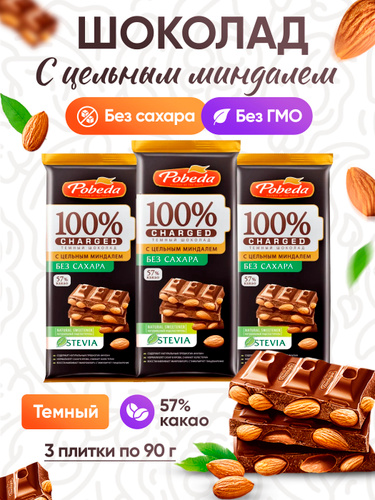 Шоколад без сахара темный Победа с миндалем плиточный 3 шоколадки