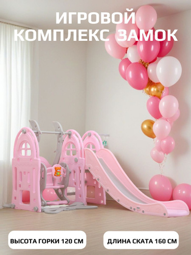 Горка детская с качелями для улицы и дома Perfetto sport Замок с баскетбольным кольцом, PS-047-P, цвет розовый
