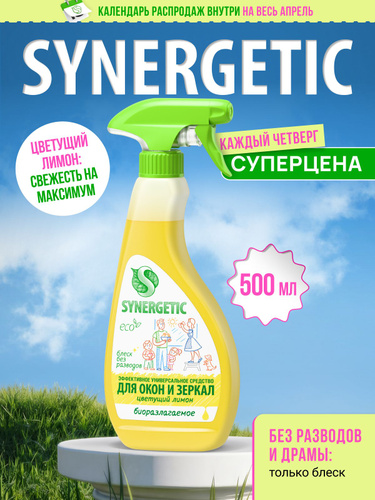 Средство для мытья стекол, окон и зеркал SYNERGETIC с антибактериальным эффектом, 0,5л