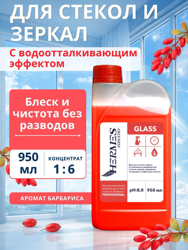 Стеклоочиститель концентрат PROFESSIONAL GLASS Барбарис, средство для стекол и зеркал без разводов, HERMES INDUSTRY 950 мл