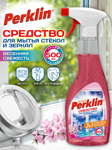 Средство для мытья стекол, зеркал, кафеля спрей/пена 500 мл, Perklin Super весенняя свежесть , распылитель, 700631