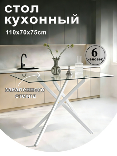 Стол Кухонный, 110*70*75cmH, чёрный закаленное стекло/ белый металл перекрещенные ножки