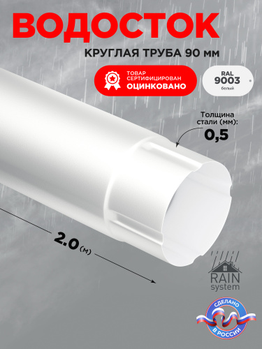 Труба 2 Метра круглая соединит., 90, металлической водосточной системы RAIN SYSTEM, цвет 9003, 1 штука