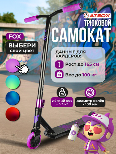 Трюковой самокат для подростков до 165 см, до 100 кг, от 5+, черно-фиолетовый, ATEOX FOX