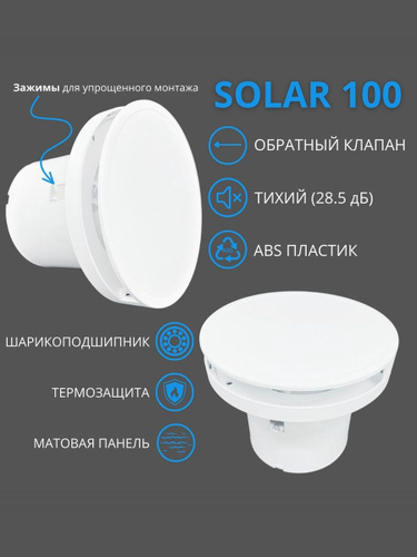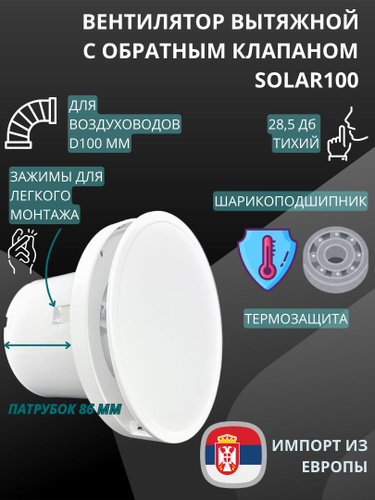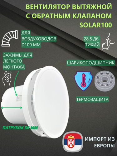 Круглый вентилятор D100мм, малошумный (28,5дБ), с обратным клапаном и креплением без сверления VENTFAN Solar100, белый матовый, Сербия