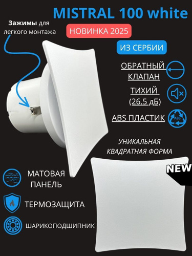 Квадратный сербский вентилятор D100мм, малошумный (26,5дБ), с обратным клапаном и креплением без сверления MISTRAL100, белый матовый
