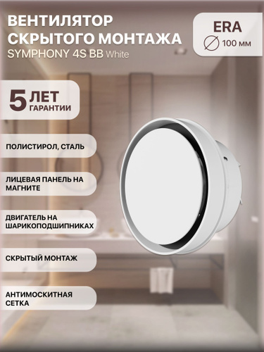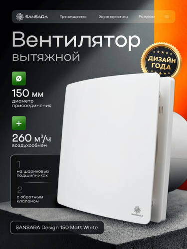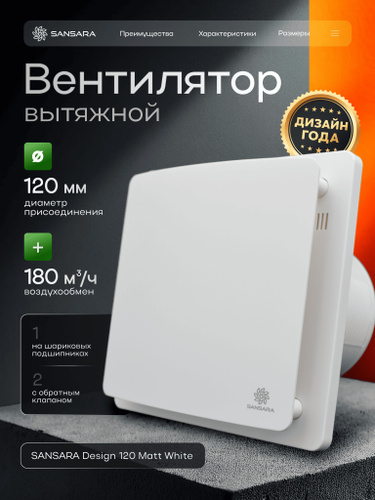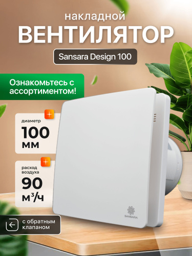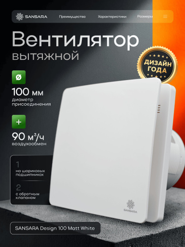 Вентилятор вытяжной 100 мм с обратным клапаном для ванной и туалета Sansara Design White, тихий (36 дБ), белый матовый