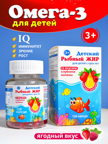 Омега 3 для детей. Рыбный жир в капсулах со вкусами клубники и малины. Для иммунитета, зрения, нервной системы, 120 штук