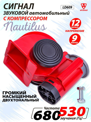 Сигнал звуковой с компрессором 12В; 139-115дБ; 680-530 Гц двухтональный воздушный автомобильный Nautilus LD609
