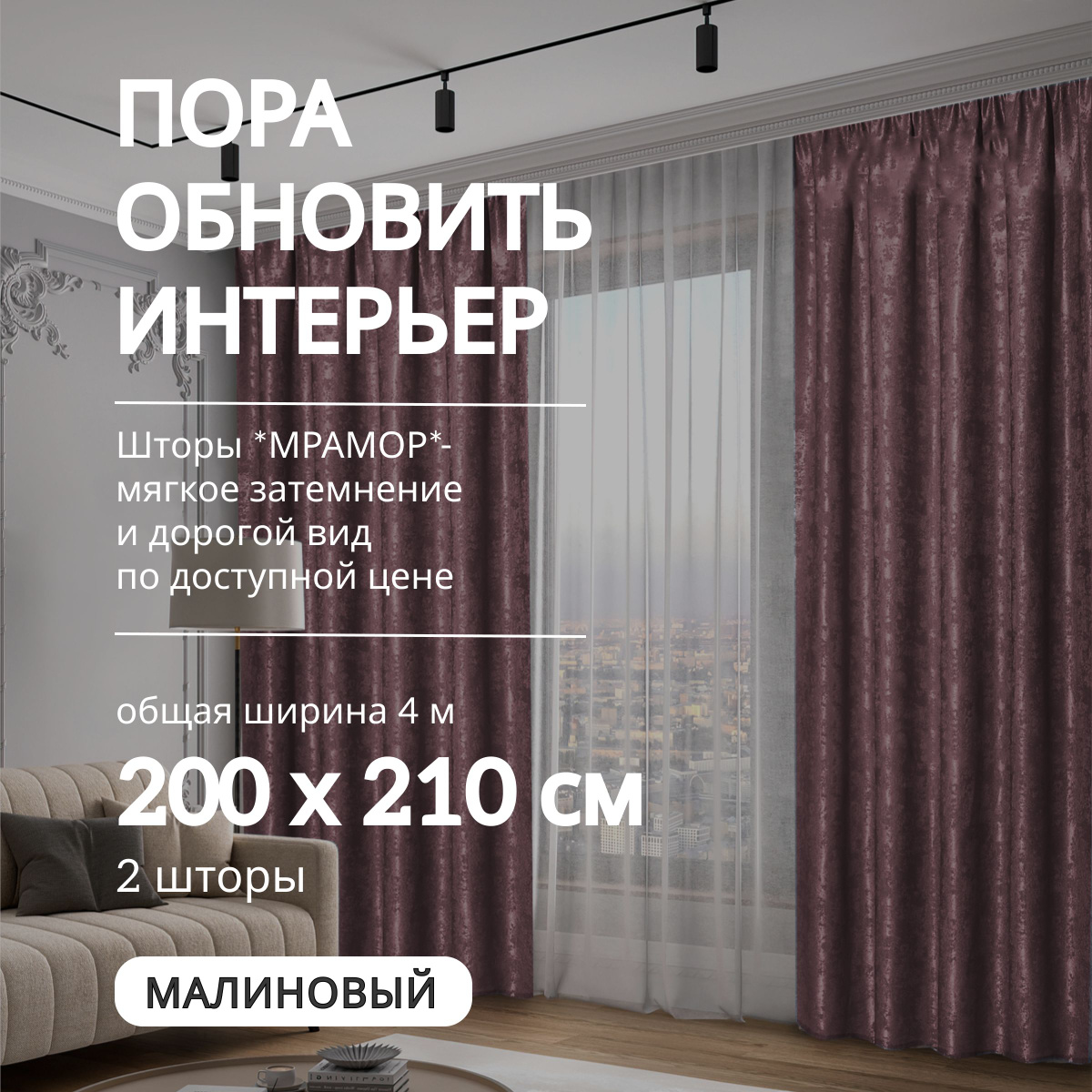 Комплект готовых малиновый комнатных штор, портьер шириной 200 см и высотой 210. Крючки для штор +/- 40шт