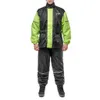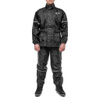 Черный мотокостюм создан для уверенной езды в любых условиях: город, бездорожье, эндуро маршруты или катание на квадроцикле. Легкая водонепроницаемая ткань из полиэстера эффективно защищает от капель, а раздельный крой (куртка + штаны) гарантирует свободу движений даже в сложном ландшафте.