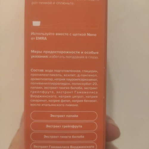 вода подготовленная, глицерин, пропиленгликоль, ксилит, ароматизатор, натрия лауроилсаркозинат, поливинилпирролидон, папаин, полисорбат-20, экстракт гингко билоба, экстракт грейпфрута, экстракт гаммамелиса Вирджинского, натрия цитрат, натрия сахаринат, натрия фитат, натрия бензоат, масло итальянского лимона