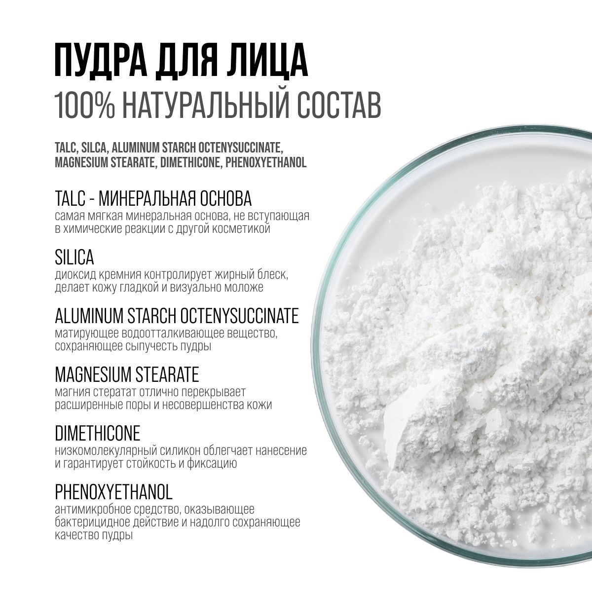 TALC, SILCA, ALUMINUM STARCH OCTENYSUCCINATE, MAGNESIUM STEARATE, DIMETHICONE, PHENOXYETHANOL