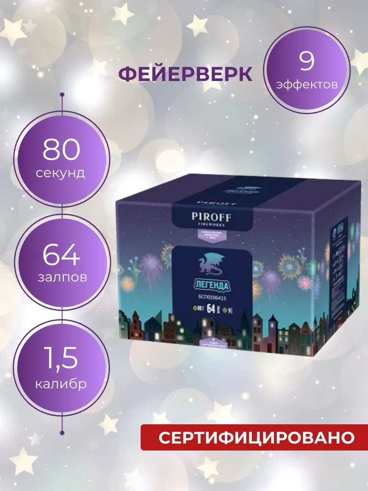 Характеристики: САЛЮТ ФЕЙЕРВЕРК "Легенда" 64 залпов калибр 1,5" 38 мм / БСП0106415 Piroff / Мощный салют на Новый год Корпоратив Свадьбу