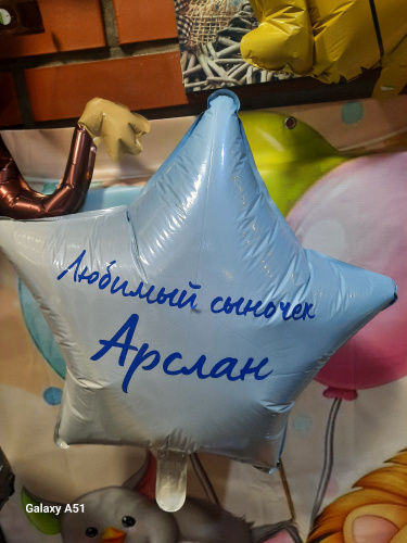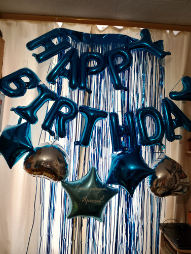 Воздушный голубой шар в форме звезды с надписью "С днем рождения, "ВАШЕ ИМЯ"!". Шар можно надуть как гелием, так и воздухом. При надуве гелием шар будет летать. Имеет встроенный клапан, благодаря чему шар будет оставаться надутым продолжительное время. Размер шара в надутом виде 36 х 40 см.